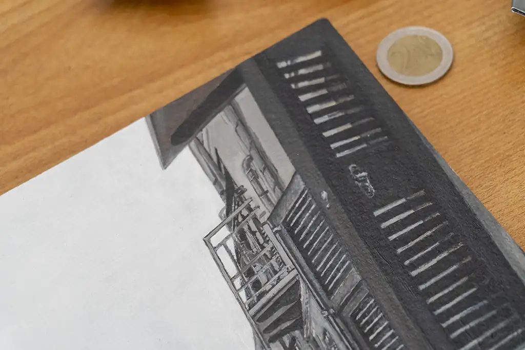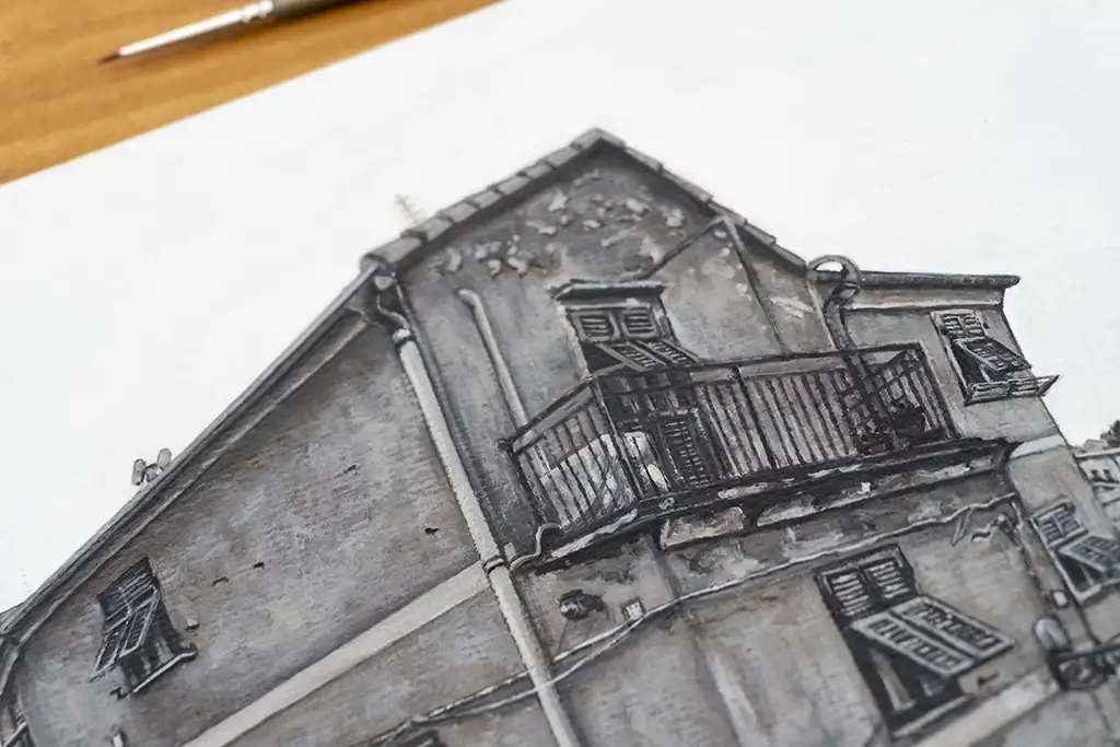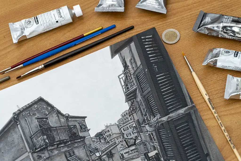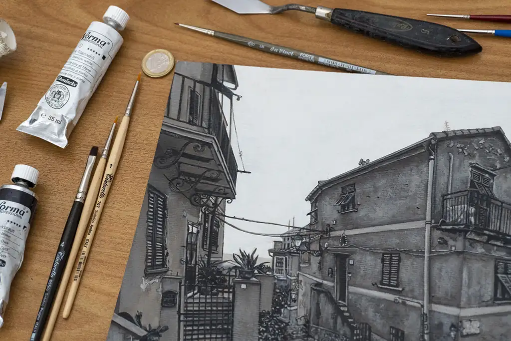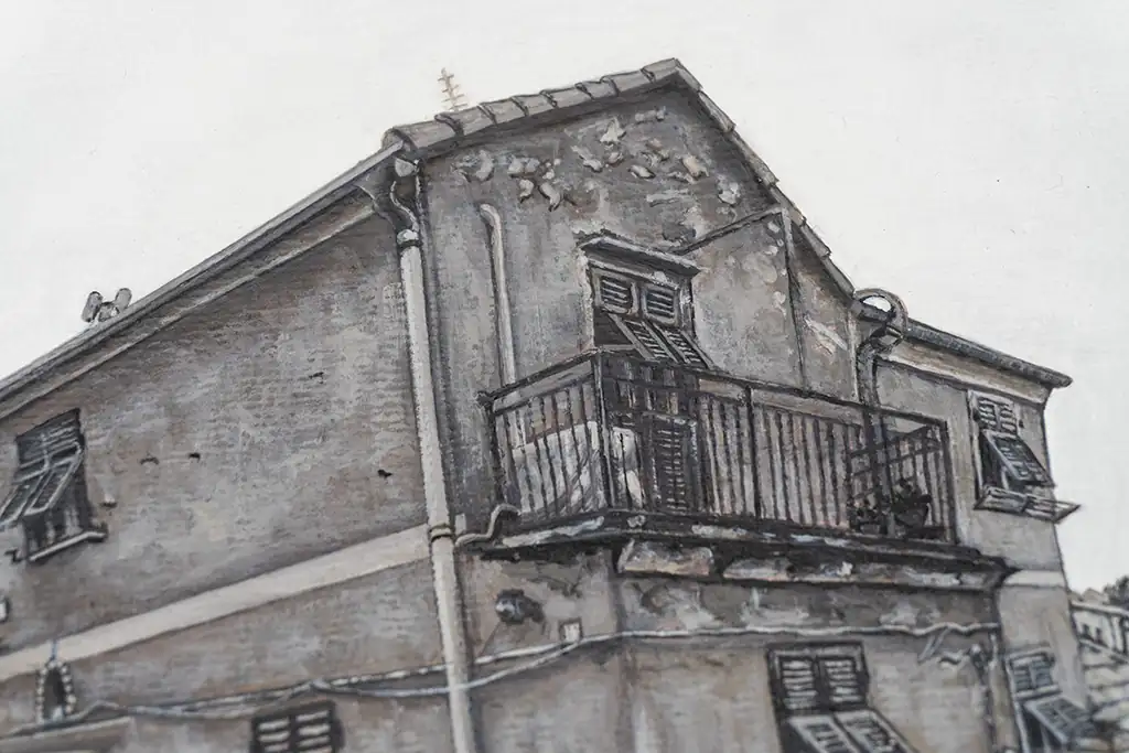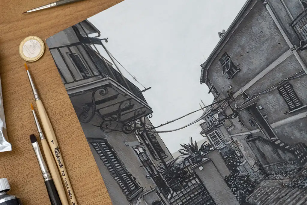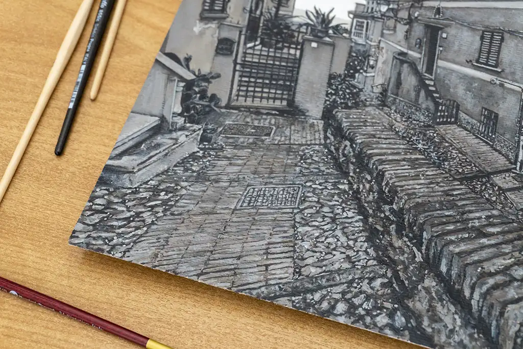 I chose to work in monochrome to focus on the textures, light, and architectural details that give the village its timeless beauty. The narrow alley, cobblestone path, and closely packed buildings create a quiet rhythm that draws the eye inward and invites reflection.